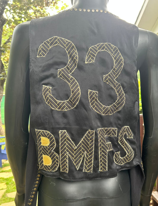 Black faux suede gold studded vest with handmade back patches